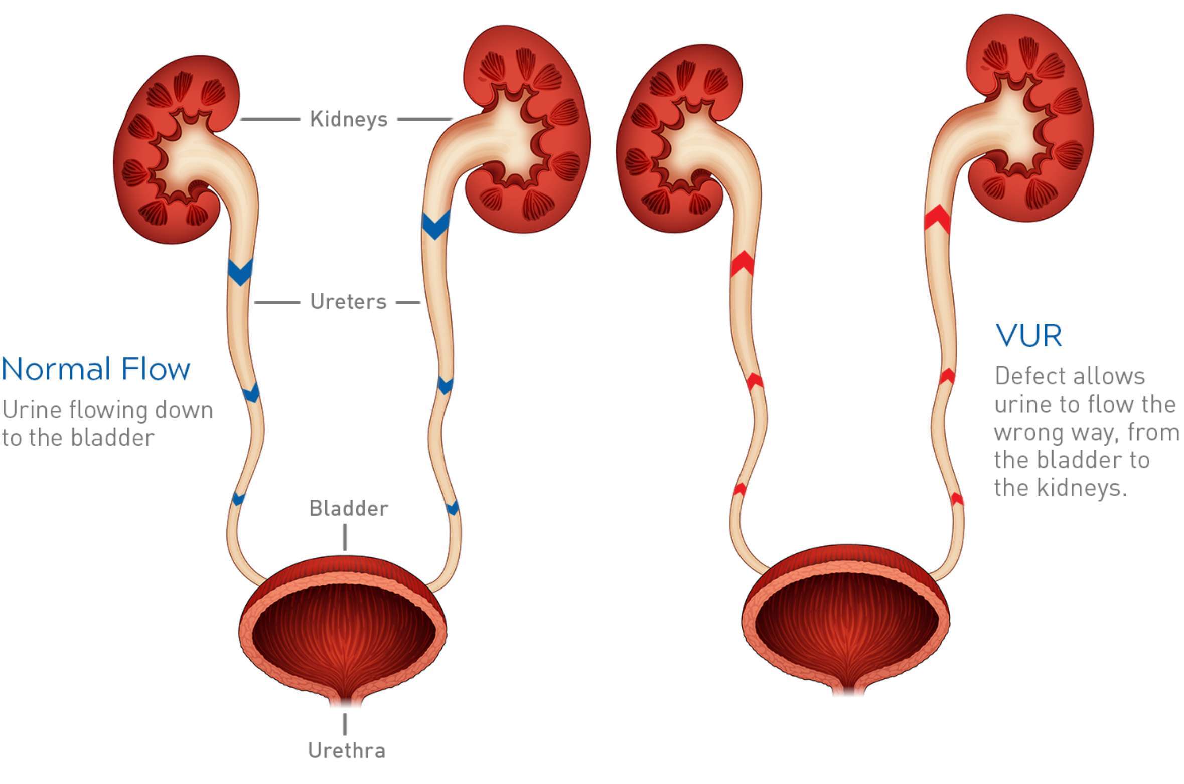 Kidney reflux, or vesicoureteral reflux (ves-ih-koe-yoo-REE-tur-ul re-flux), commonly known as VUR, is a condition in which urine from the bladder backs up into the ureters. The ureters are the tubes that carry the urine from the kidneys down to the bladder. The ureters have a one-way valve system that normally stops urine from going from the bladder back up the ureters in the wrong direction. Sometimes when a child has VUR, urine can flow all the way back up into the kidney, and the valve system doesn’t work.